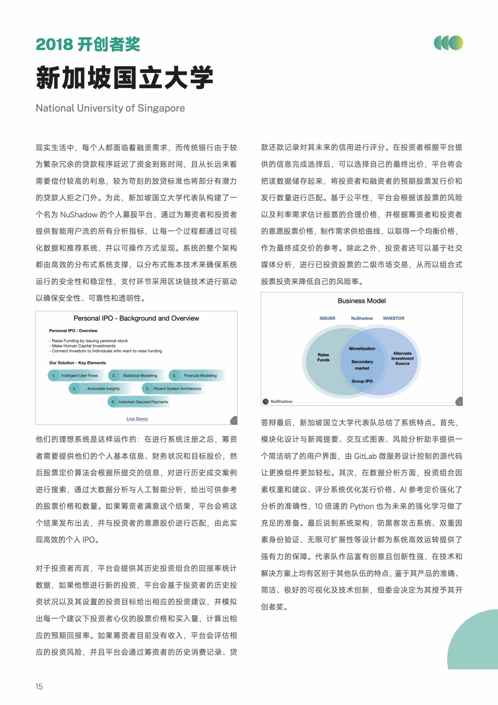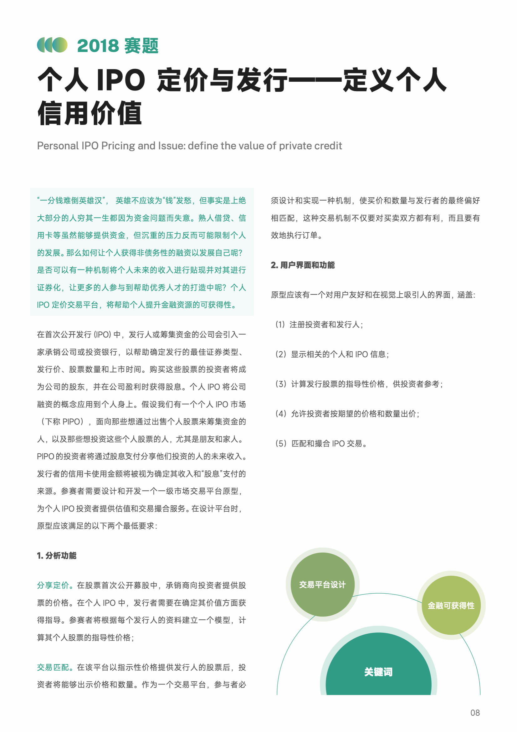 Personal IPO provides private individuals access to funding at an early stage of their adult life by offering investors returns that are linked to the individual’s future spending. Chengdu 80 participants will develop a prototype that can price and issue the personal IPO to a registered pool of investors. Sample data including issuers’ profile and previous one-year average credit card spending across various factors will be provided.